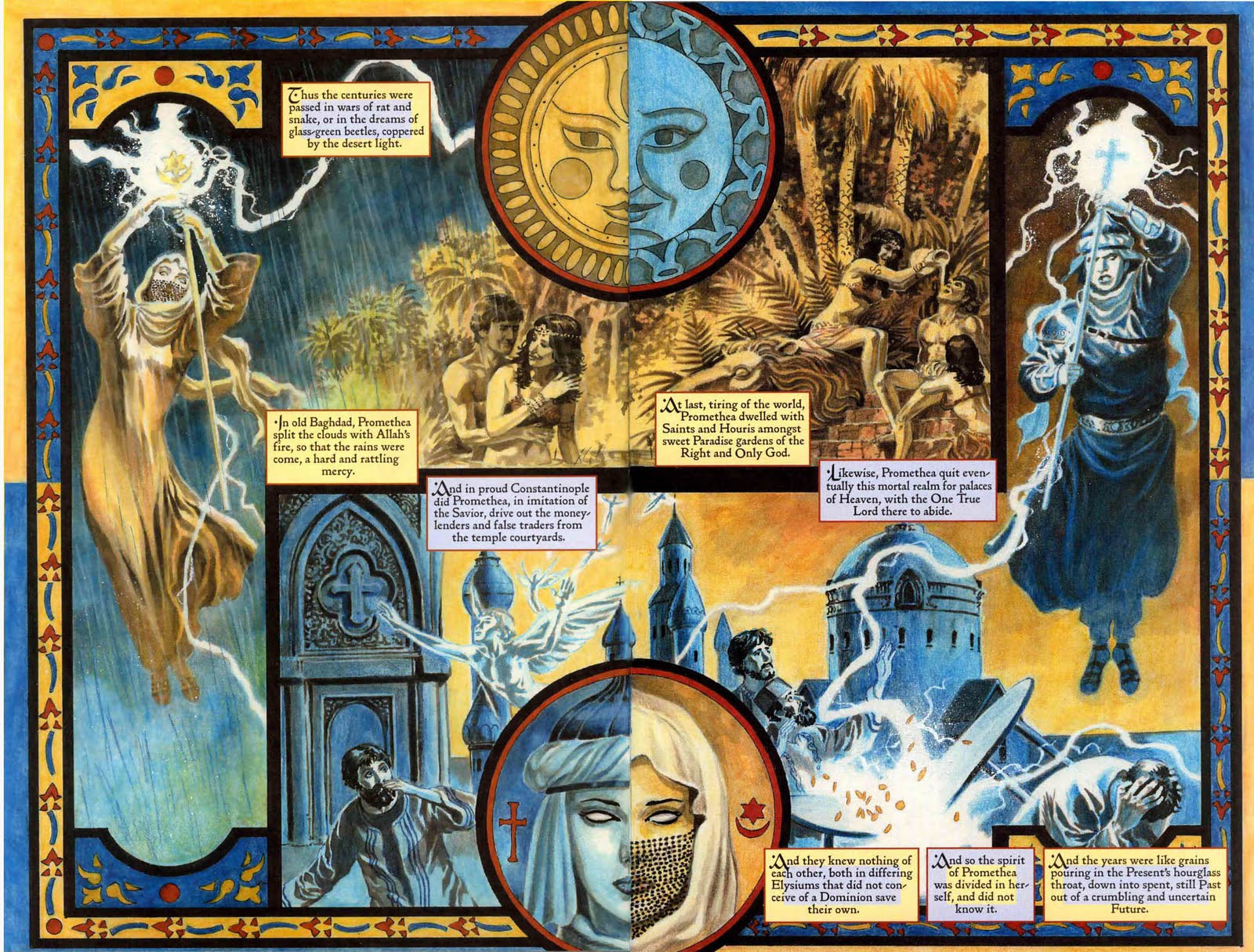 Pod koniec XX wieku przemysł komiksowy stał się bezpieczną kryjówką dla wszelkiej maści mistyków. Nietrudno zauważyć, że złoty okres tej tendencji zbiegł się z dojrzewaniem amerykańskiego mainstreamowego komiksu i tzw. British Invasion. Oczywiście elementy mistycyzmu były obecne wcześniej w amerykańskim komiksie - jednak były bardzo powierzchowne i postawione na chybotliwej spuściźnie pulpowych fantastów początku XX wieku (H.P. Lovecrafta, R.E. Howarda i pomniejszych) czerpiących głównie ze szczątkowych materiałów, które dostarczały im popularne wówczas publikacje Madame Bławatskiej. Europejczycy mający dużo dłuższą tradycję ezoteryczną - nie odżegnując się ani od pulpowych wzorców ani od Bławatskiej - potraktowali tematykę znacznie poważniej. Sam Alan Moore był jednym z pierwszych Brytyjczyków piszących regularnie na amerykański rynek. Pytany o magię twierdzi, że w jej tajniki wszedł stosunkowo późno, bo po czterdziestce - żartuje, że miało to się stać jego remedium na kryzys wieku średniego. Jednak czytając jego wcześniejsze prace dostrzec można, że jego wizja świata już wcześniej była jakoś zbieżna z tym, co będzie prześladować jego twórczość na przełomie wieków. Odpytywany dalej podkreśla, że dla niego magia jest nierozerwalnie związana z aktem kreacji - tworzeniem światów, historii, eksploracją mitów. "Promethea" jest fabularyzowaną manifestacją jego poglądów na ten temat. Przy czym jest równie znakomitym komiksem, jak podręcznikiem magii.